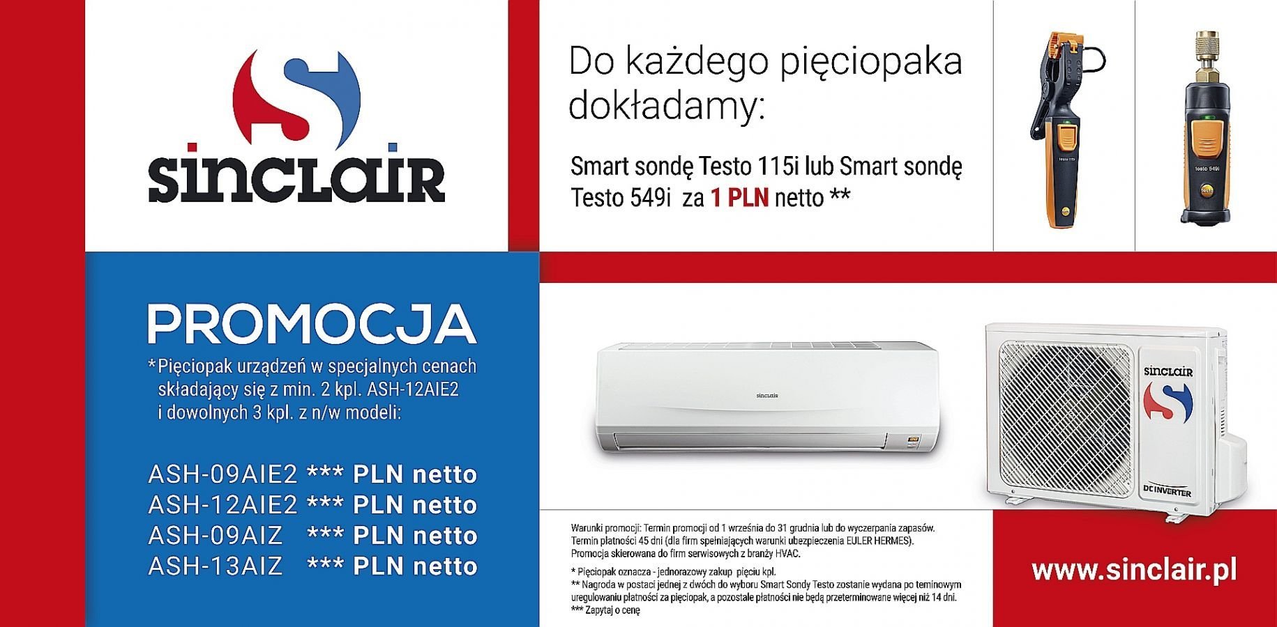 Pięciopaki wybranych urządzeń Sinclair kupisz teraz w specjalnych cenach, dodatkowo otrzymasz Smart sondę Testo 115i lub Testo 549i za 1 zł netto. Promocja trwa do końca roku lub do wyczerpania zapasów. Szczegóły w ulotce poniżej.